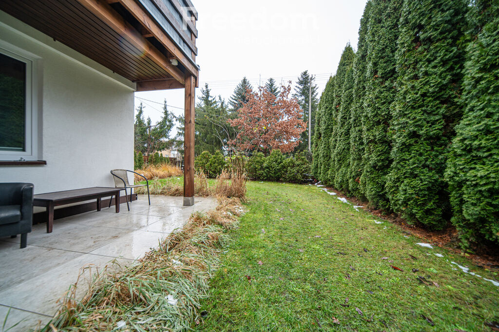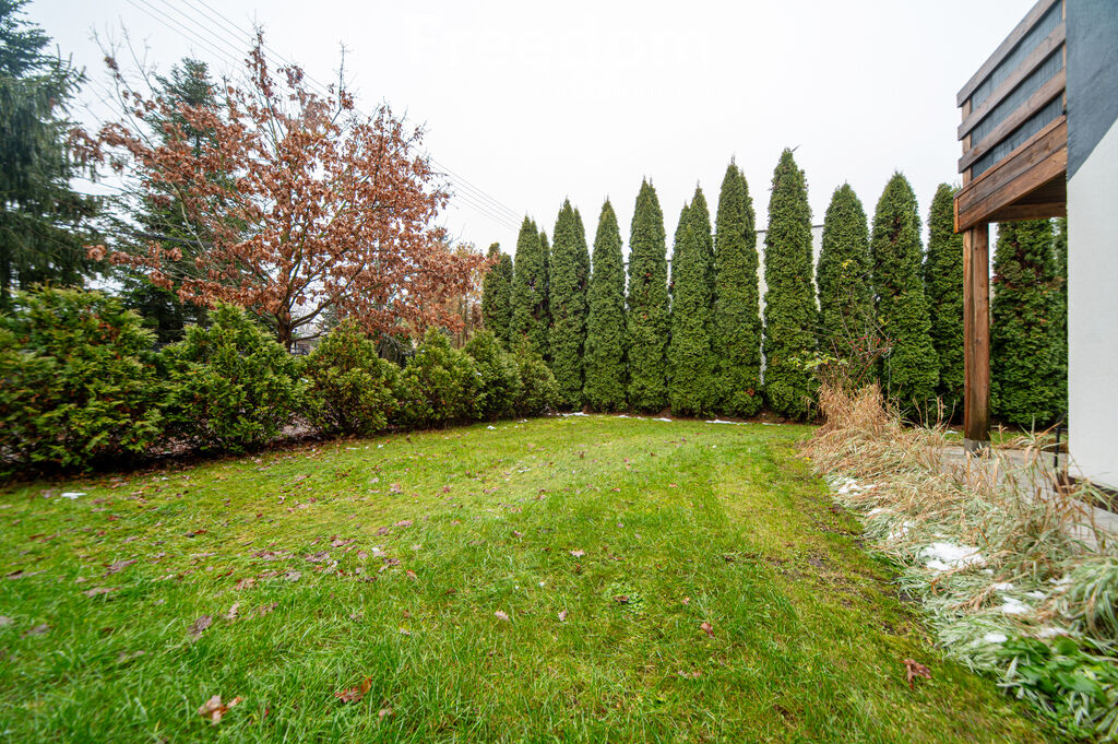 Gęste nasadzenia, trawa i elementy drewniane podkreślają charakter